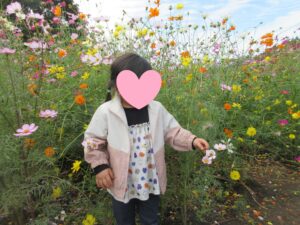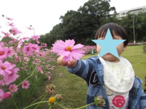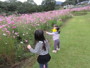 こどもたちは興味津々になりながら、一面に咲いているきれいなコスモスたちを見つめていました😊